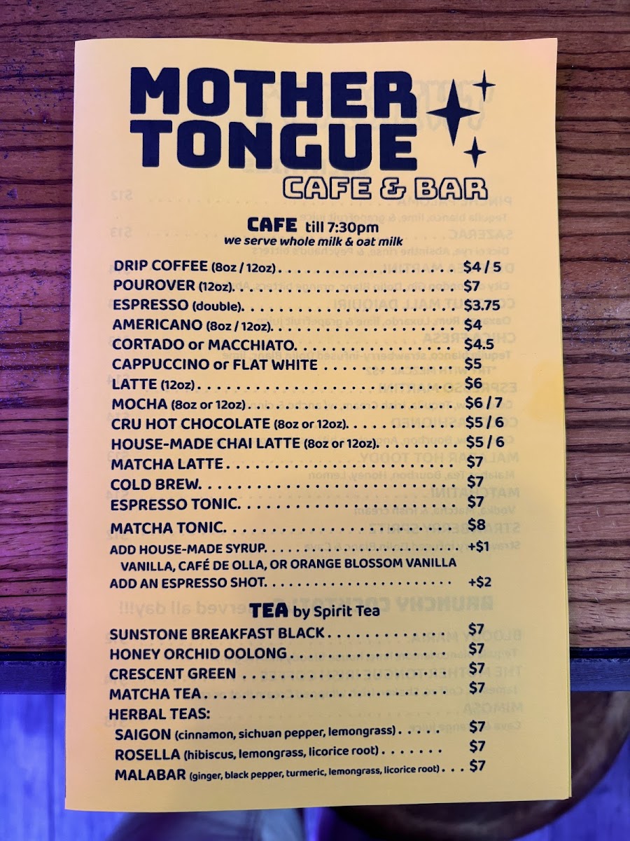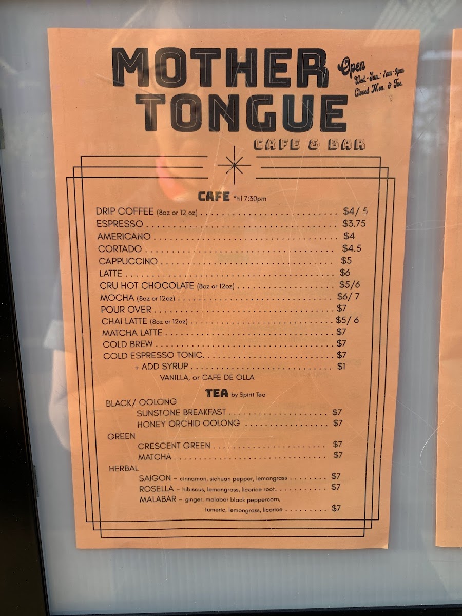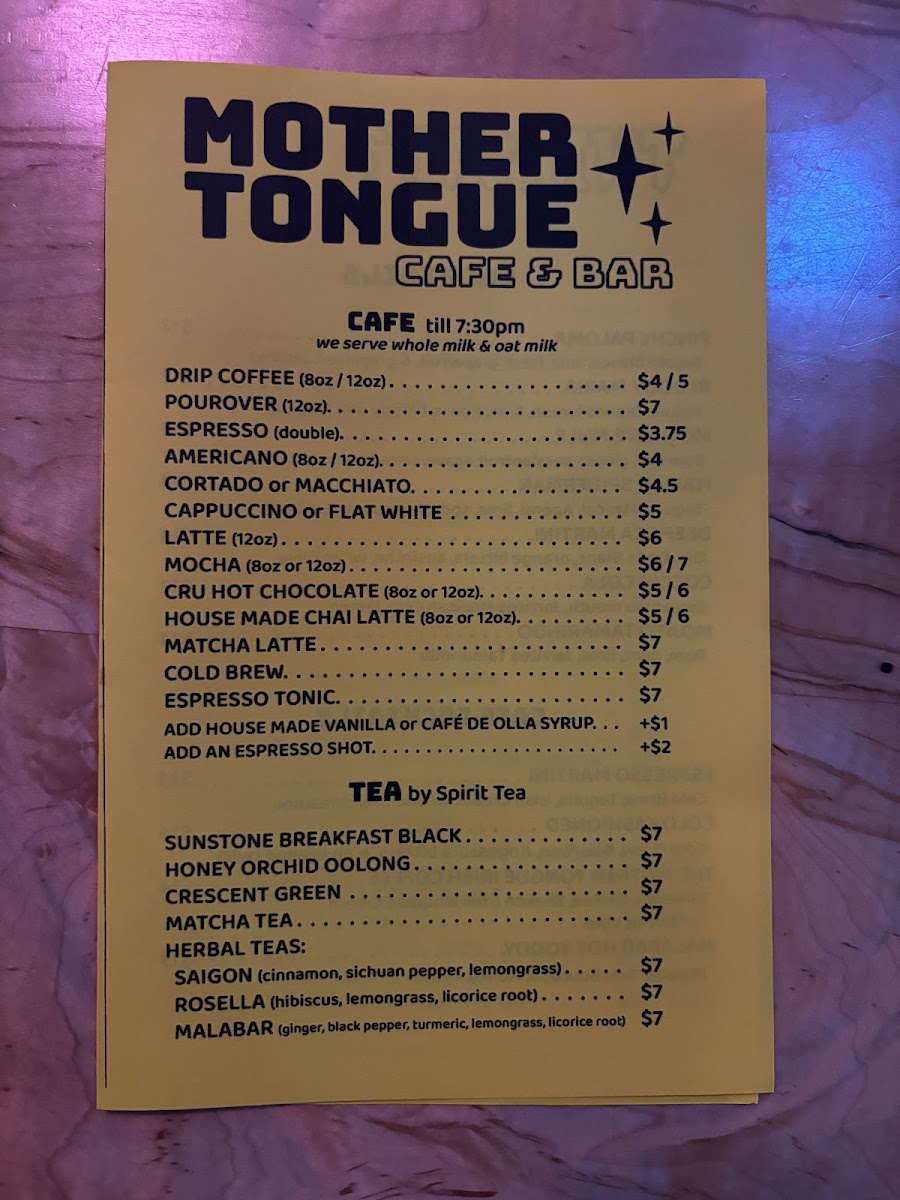 Mother Tongue Cafe & Bar Menu